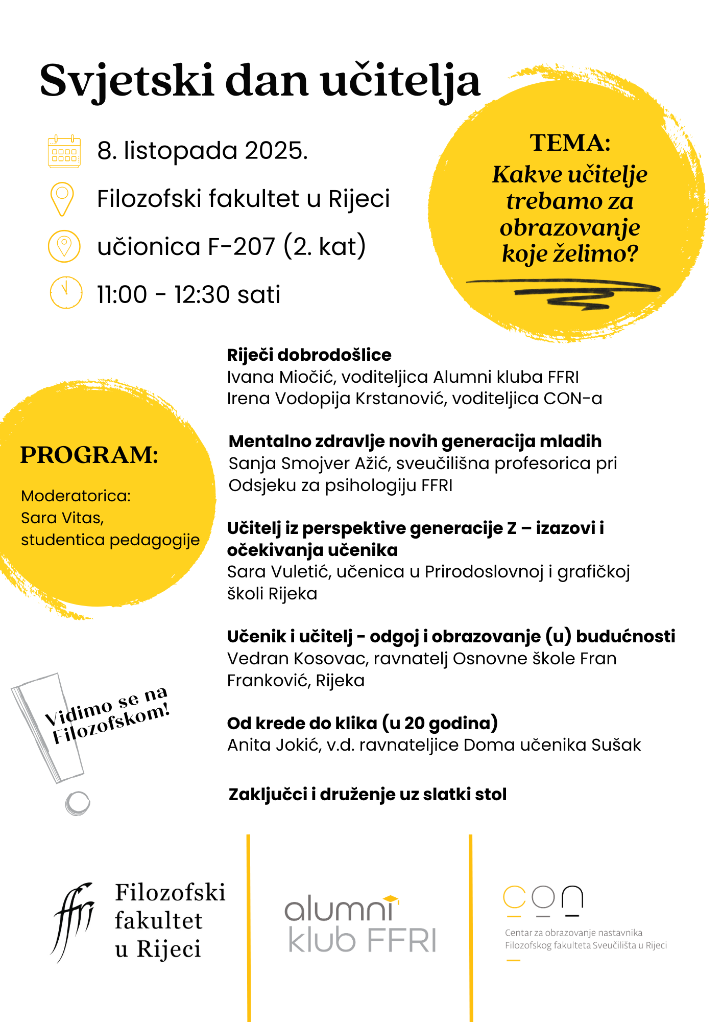 Program organiziraju Centar za obrazovanje nastavnika i Alumni klub Filozofskoga fakulteta u Rijeci, a gosti će iz različitih perspektiva podijeliti svoja iskustva i razmišljanja o tome kako učitelji mogu ostati u središtu obrazovnih prioriteta.