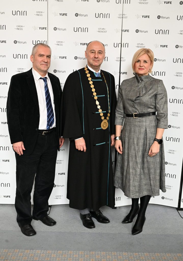 Stojim pred vama s dubokim osjećajem zahvalnosti, ponosa i uvjerenja u budući iskorak i daljnji razvoj Sveučilišta. Inauguracija novog rektora nije samo formalni, svečani, administrativni čin. Ona je svečani trenutak kontinuiteta kojim se potvrđuje stabilnost institucije, njezina zrelost i njezina sposobnost da se razvija. 1800 zaposlenika Sveučilišta u Rijeci svakodnevno doprinose stjecanju i diseminaciji znanja, inovacijama i društvenom razvoju. Ne umanjujući dopirinosr ranijih čelnika, dupustit ćete mi da istaknem doprinos posljednje troje, a to su: akademik Daniel Rukavina, prof. dr. sc. Pero Lučin i prof. dr. sc. Snježana Prijić Samaržija. Oni su imali izniman doprinos u tome da Sveučilište u Rijeci postane ne samo obrazovna i znanstvena institucija, već prostor kritičkog mišljenja, društvene odgovornosti i otvorenog dijaloga. U proteklim godinama zajedno smo prošli i prilagođavali se razdoblju intenzivnih promjena. Posebno želim iskazati iskrenu zahvalnost bivšoj rektorici prof. dr. sc. Snježani Prijić Samaržiji, u čija sam dva mandata djelovao kao prorektor, koja je svojim vizionarstvom, hrabrošću i jasnim vrijednosnim stavom ostavila upečatljiv trag u razvoju našeg Sveučilišta. Njezine mandate obilježili su strateški iskoraci u području akademske autonomije, rodne ravnopravnosti, otvorene znanosti i međunarodnog pozicioniranja. Kao vršitelj dužnosti rektora koji danas i protokolarno predaje svoju dužnost, osjećam zadovoljstvo što smo u proteklom razdoblju, kroz programski ugovor osigurali i financijsku stabilnost i stvorili temelje za daljnji razvoj. Posebno me raduje što smo uspjeli osnažiti mlade istraživače, povećati broj doktoranada uključenih u međunarodne projekte te razviti nove studijske programe koji odgovaraju potrebama suvremenog tržišta rada i društva u cjelini. Naravno, nijedno postignuće nije rezultat pojedinca. Ono je rezultat zajednice. Rezultat rada nastavnika, znanstvenika, administrativnog osoblja, tehničkih službi i prije svega naših studenata. Sveučilište nije samo zgrada, oprema, statut, proračun… Sveučilište su prvenstveno ljudi. Duboko sam uvjeren da će novo vodstvo na čelu s novim rektorom nastaviti graditi Sveučilište u duhu akademske izvrsnosti, otvorenosti prema svijetu i odgovornosti prema društvu. Pred njime su mnogi izazovi: nestabilno međunarodno okruženje, imperativ digitalne transformacije, umjetna inteligencija u znanosti i obrazovanju, svekolika održivost, negativne demografske promjene i potreba za snažnijom povezanošću s gospodarstvom… No, uvjeren sam da zajedno sa svima vama, imaju znanje, ambiciju i energiju da na te izazove odgovore odlučno, promišljeno i progresivno. Naša je obveza da Sveučilište ostavimo snažnijim nego što smo ga zatekli. Da studentima pružimo ne samo diplomu, već iskustvo rasta. Da znanstvenicima osiguramo uvjete za slobodno istraživanje. Da društvu budemo savjest i pokretač razvoja. Rijeka je grad otvorenosti, različitosti i hrabrosti. Takvo mora ostati i naše Sveučilište – hrabro u idejama, humano, otvoreno u dijalogu i čvrsto u promicanju svojih vrijednosti. Zahvaljujem svim suradnicima na povjerenju, podršci i kritici koja nas je činila boljima i upozorila da možemo i trebamo bolje i više. Zahvaljujem studentima koji su nas podsjećali zašto postojimo. Zahvaljujem gradu i regiji na partnerstvu koje je uvijek bilo puno više od formalnosti. S vjerom u kontinuitet rasta i razvoja, s povjerenjem u novo vodstvo i s ponosom na sve što smo do sada postigli, predajem tradicionalnu insigniju rektorske časti – rektorski lanac Sveučilišta u Rijeci koji simbolizira čast, odgovornost i trajnost institucije prof. dr. sc. Goranu Hauseru, uvjeren da će pod njegovim vodstvom Sveučilište u Rijeci otvoriti nova poglavlja uspjeha. Semper Magis!