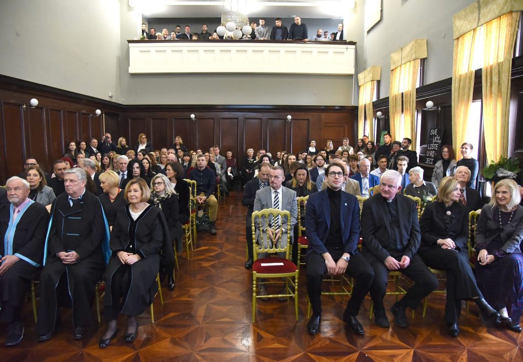 Želim ovom prigodom zahvaliti ranijoj rektorici profesorici Snježani Prijić Samaržiji, koja je u svoja 2 rektorska mandata ostavila dubok trag na povijesnoj crti ovoga Sveučilišta. Želim također uputiti i čestitku novoizabranom rektoru Sveučilišta profesoru Goranu Hauseru; uvjeren sam kako će svoje ideje o napretku Sveučilišta uspjeti provesti u djelo. Još jednom iskrene čestitke svim nagrađenima i hvala uvaženim gostima na dolasku. Svima vam želim sretan i blagoslovljen Božić te uspješnu i mirnu novu godinu!
