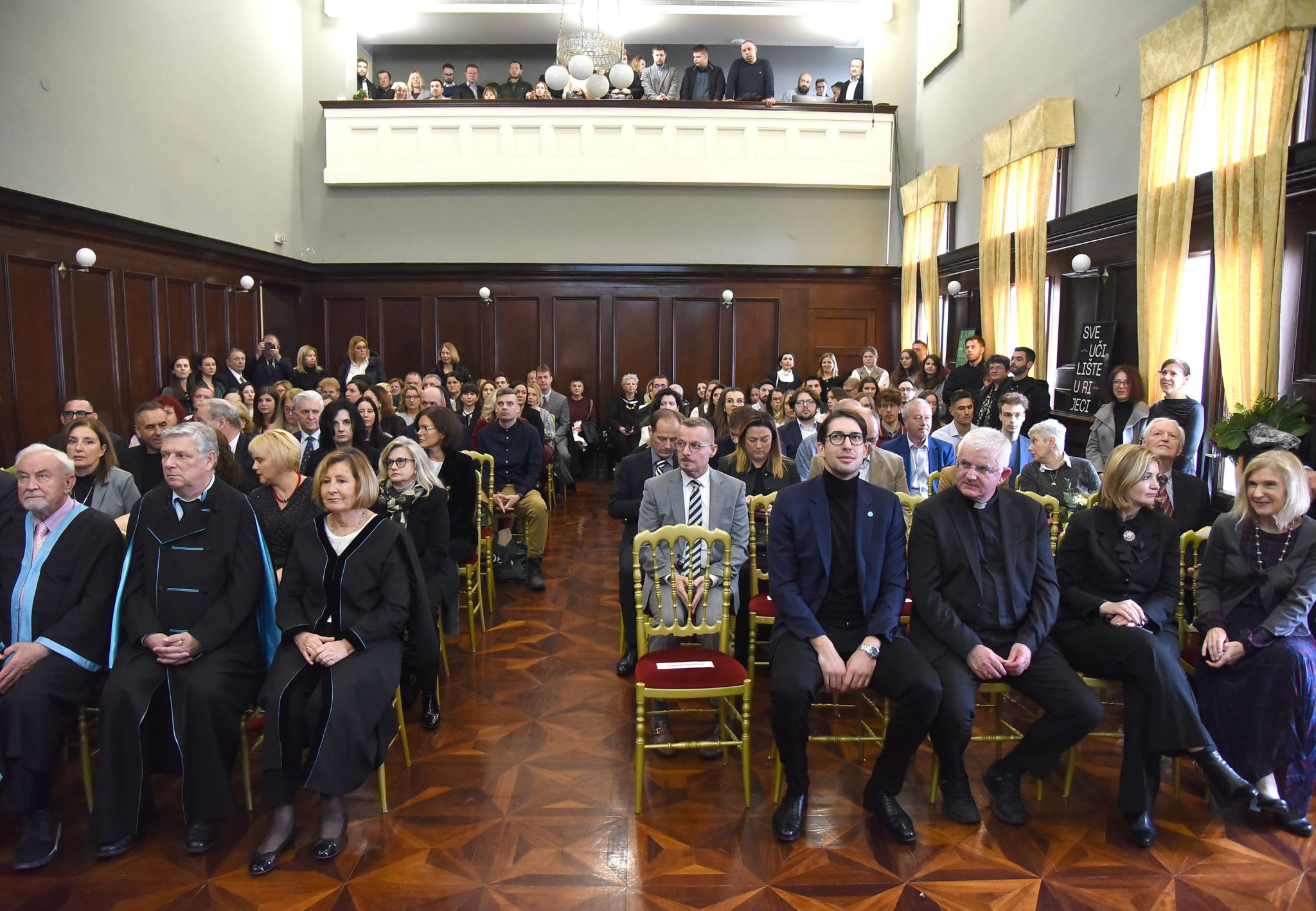 Želim ovom prigodom zahvaliti ranijoj rektorici profesorici Snježani Prijić Samaržiji, koja je u svoja 2 rektorska mandata ostavila dubok trag na povijesnoj crti ovoga Sveučilišta. Želim također uputiti i čestitku novoizabranom rektoru Sveučilišta profesoru Goranu Hauseru; uvjeren sam kako će svoje ideje o napretku Sveučilišta uspjeti provesti u djelo. Još jednom iskrene čestitke svim nagrađenima i hvala uvaženim gostima na dolasku. Svima vam želim sretan i blagoslovljen Božić te uspješnu i mirnu novu godinu!