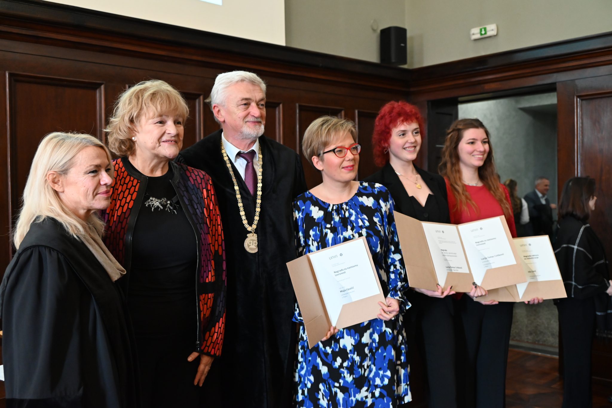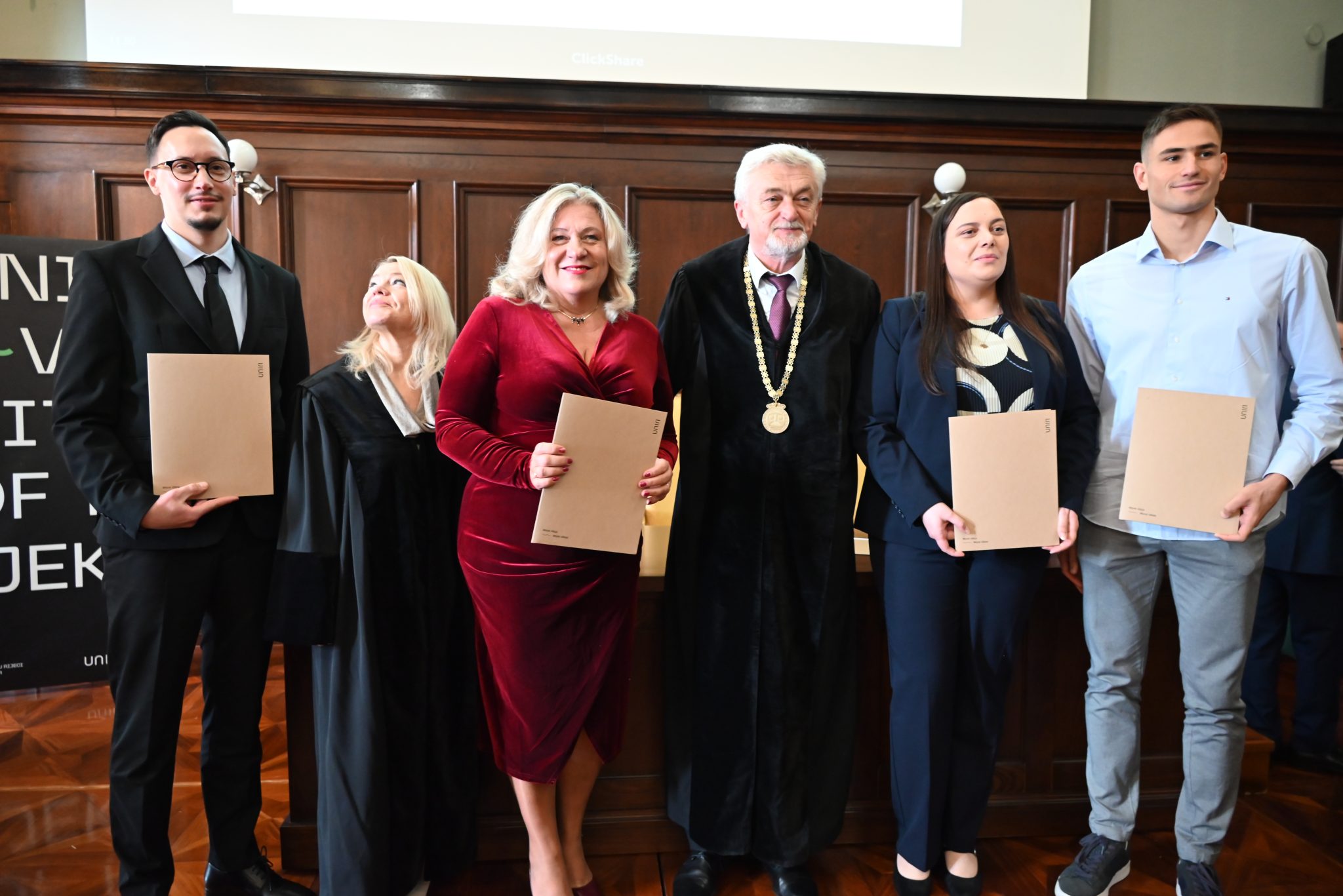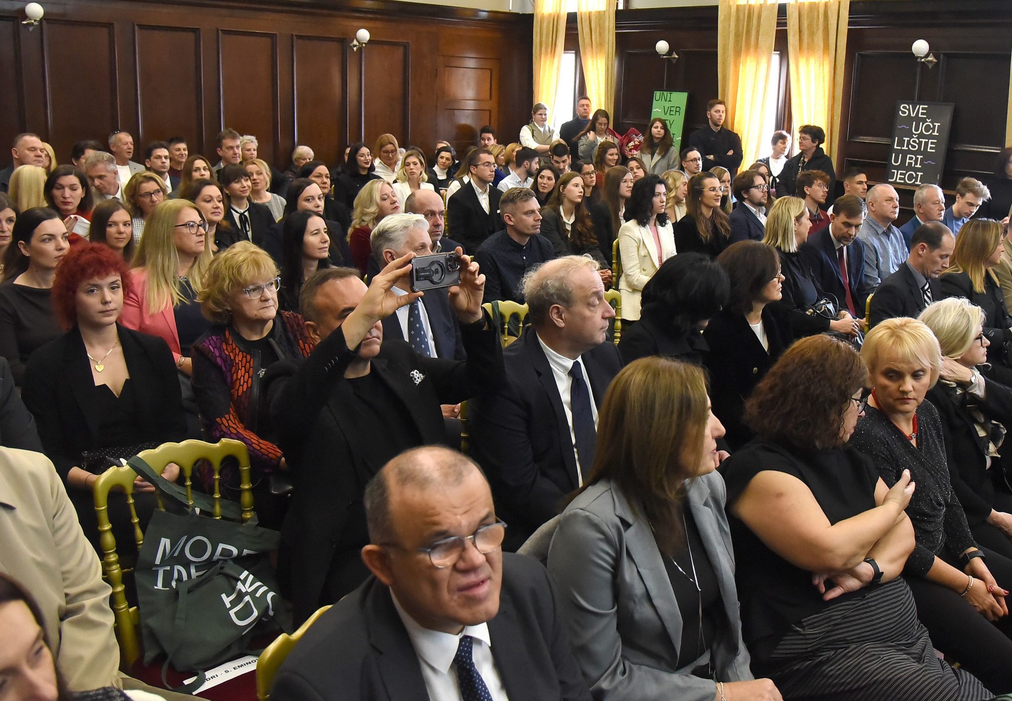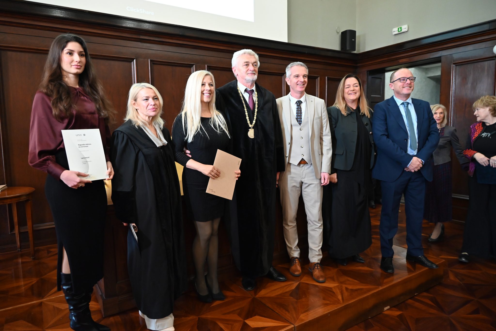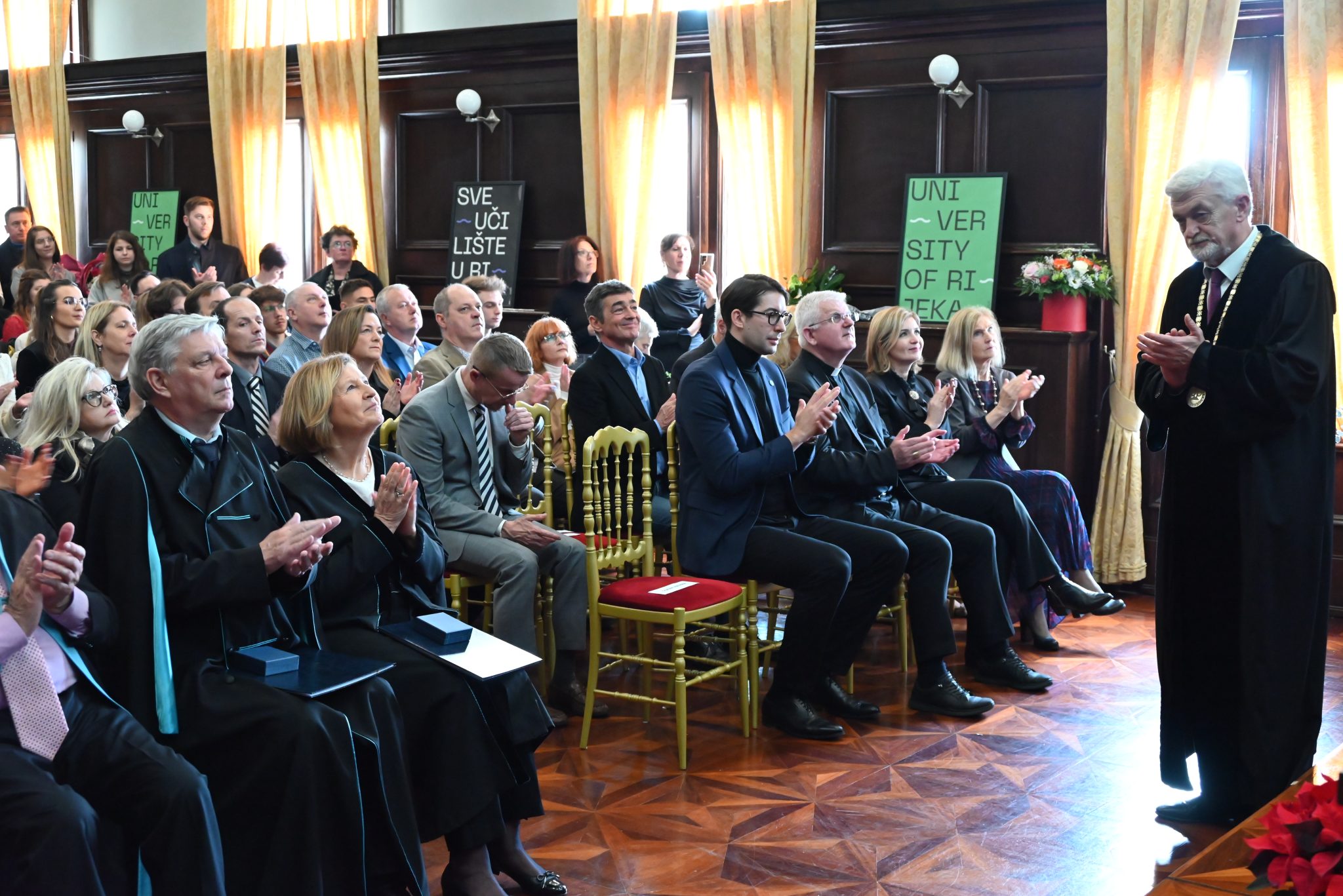 Vratimo se našim današnjim laureatima; vi ste svojim znanjem i vještinama, upornošću, trudom i zalaganjem postigli najviše rezultate i na ponos ste Sveučilištu u Rijeci, ali i gradu, regiji i čitavoj Hrvatskoj i stoga vam čestitam na nagradama i priznanjima koje će vam upravo biti uručene. Svima vam, od naših najmudrijih – professora emerita, preko cijele znanstvene vertikale, onih koji često daleko od reflektora, grade ugled i snagu našega Sveučilišta, do naših studenta, zbog kojih uostalom i postojimo, iskreno čestitam i želim i da i dalje ustrajete u svojem radu i doprinosite našoj akademskoj zajednici. Vi ste razlog zbog kojeg Sveučilište postoji i budućnost koju s ponosom gradimo.