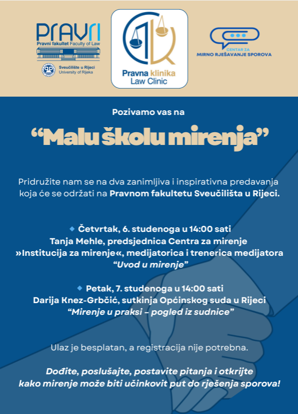 Klinika Pravnog fakulteta Sveučilišta u Rijeci i Centar za mirno rješavanje sporova pozivaju zainteresiranu javnost i studente da se pridruže „Maloj školi mirenja“, koja će se održati 6. i 7. studenoga 2025. u 14 sati na Pravnom fakultetu Sveučilišta u Rijeci.