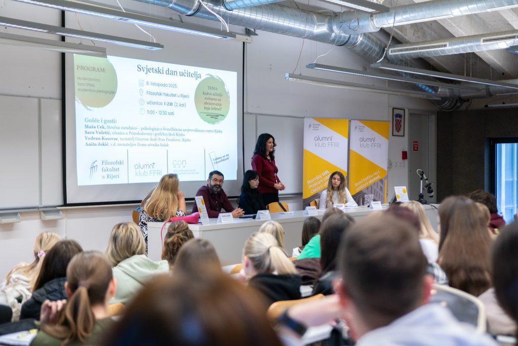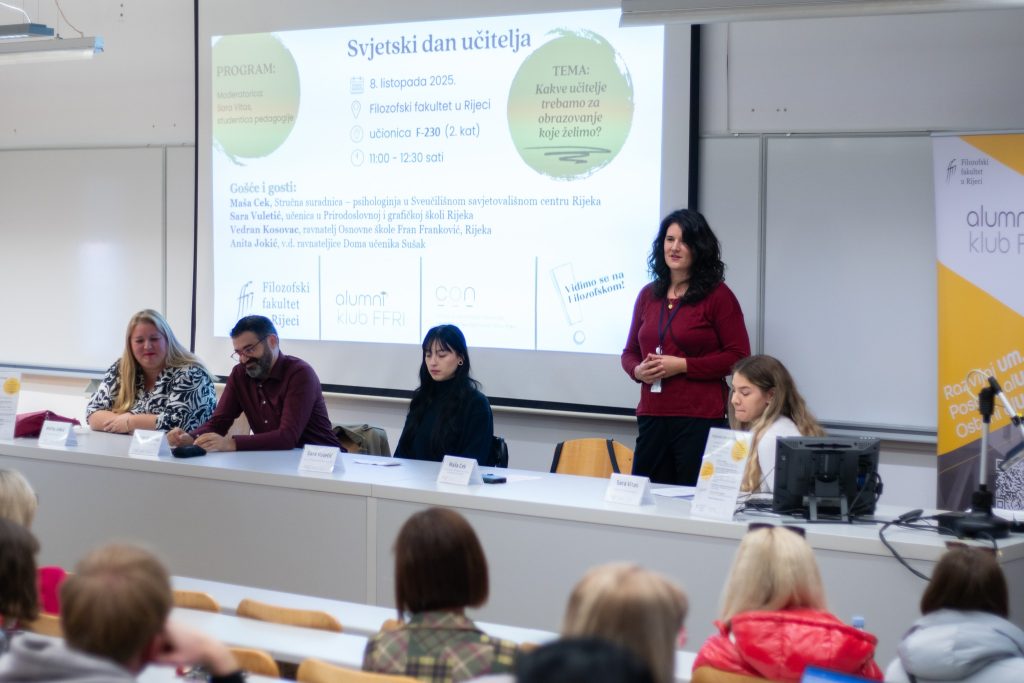 Filozofski fakultet Sveučilišta u Rijeci i ove je godine, u organizaciji Centra za obrazovanje nastavnika i Alumni kluba Filozofskoga fakulteta, obilježio Svjetski dan učitelja pod naslovom „Kakve učitelje trebamo za obrazovanje koje želimo?“. Cilj programa bio je otvoriti raspravu o izazovima suvremenog obrazovanja, potrebama novih generacija učenika te kompetencijama i vrijednostima koje učitelji trebaju razvijati kako bi obrazovanje bilo relevantno, uključivo i usmjereno prema budućnosti.