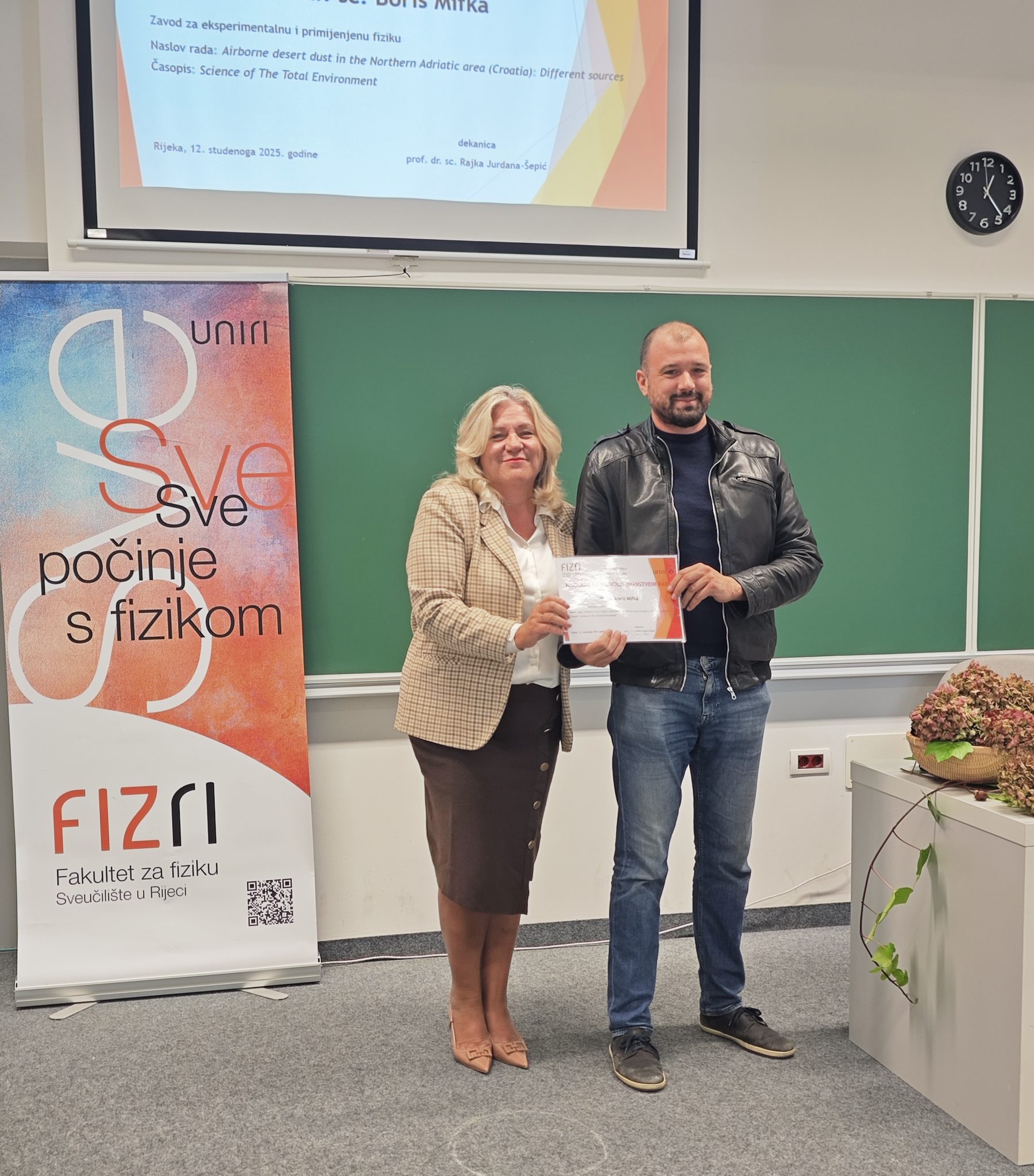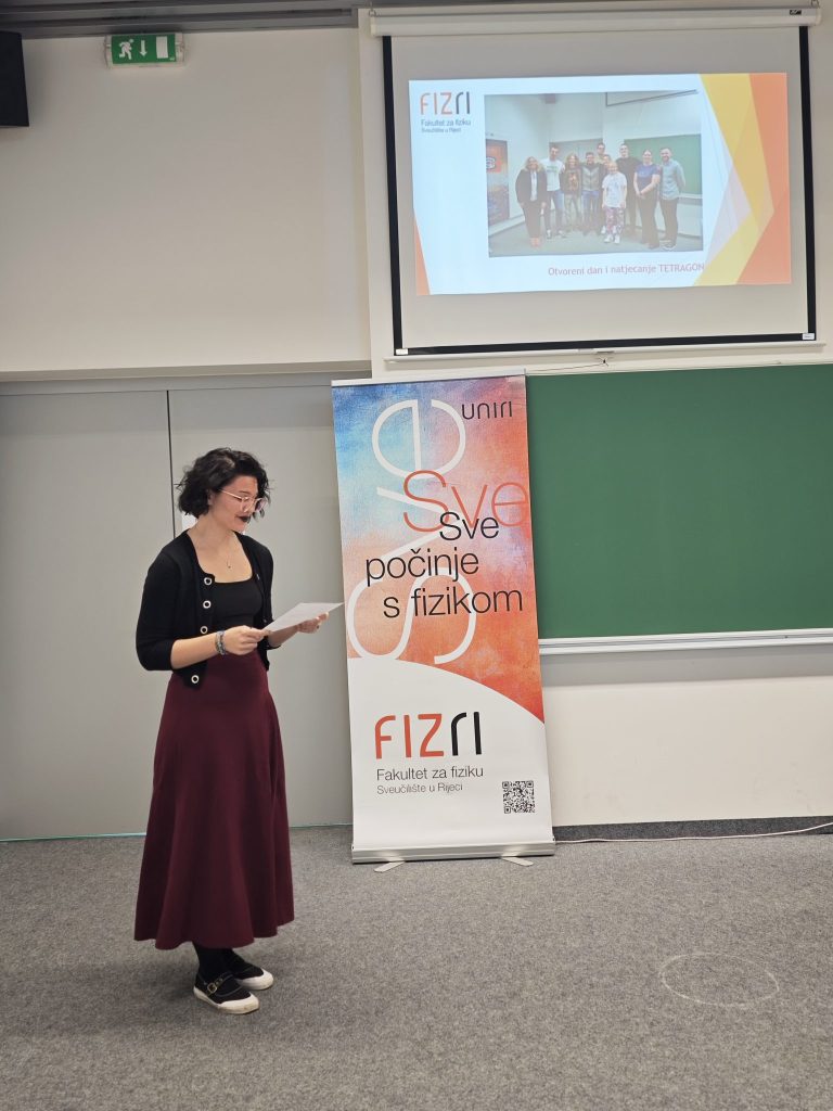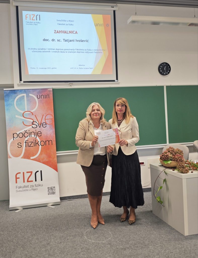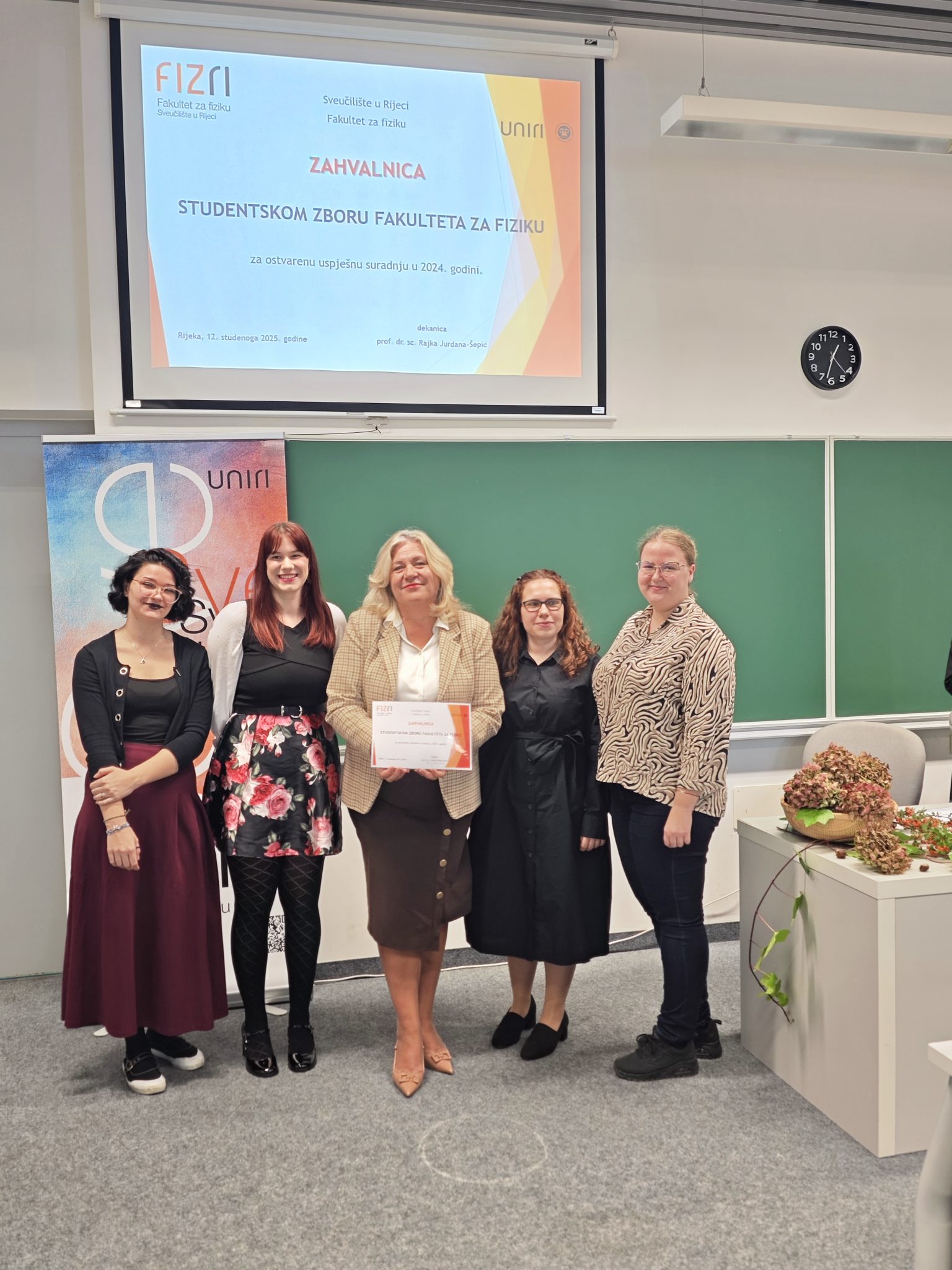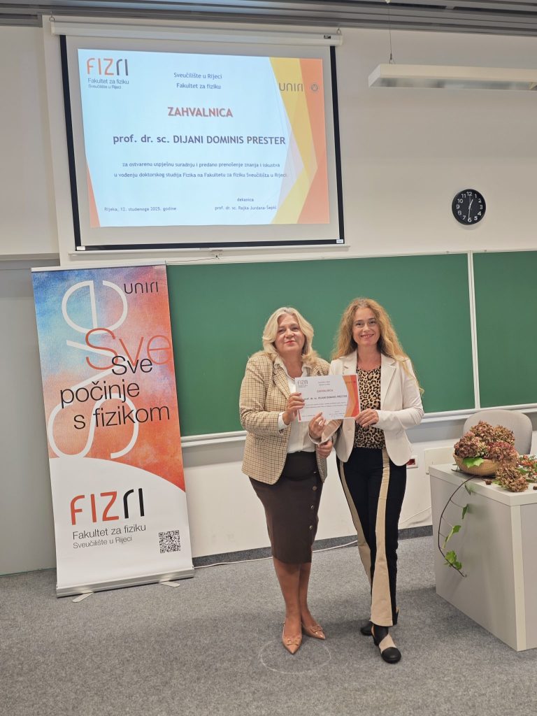 Povodom Dana Fakulteta za fiziku Sveučilišta u Rijeci 12. studenoga 2025. održana je svečana sjednica Fakultetskog vijeća. Dekanica prof. dr. sc. Rajka Jurdana-Šepić osvrnula se na uspjehe protekle godine, među kojima se osobito ističe rast projektne aktivnosti – na Fakultetu je trenutačno aktivno 17 kompetitivnih projekata. Fakultet kontinuirano unaprjeđuje kvalitetu nastave na svim razinama studija, izvodi nastavu fizike na šest sastavnica Sveučilišta u Rijeci i ostvaruje široku suradnju s partnerskim institucijama, uključujući KBC Rijeka i Institut za fiziku Zagreb.