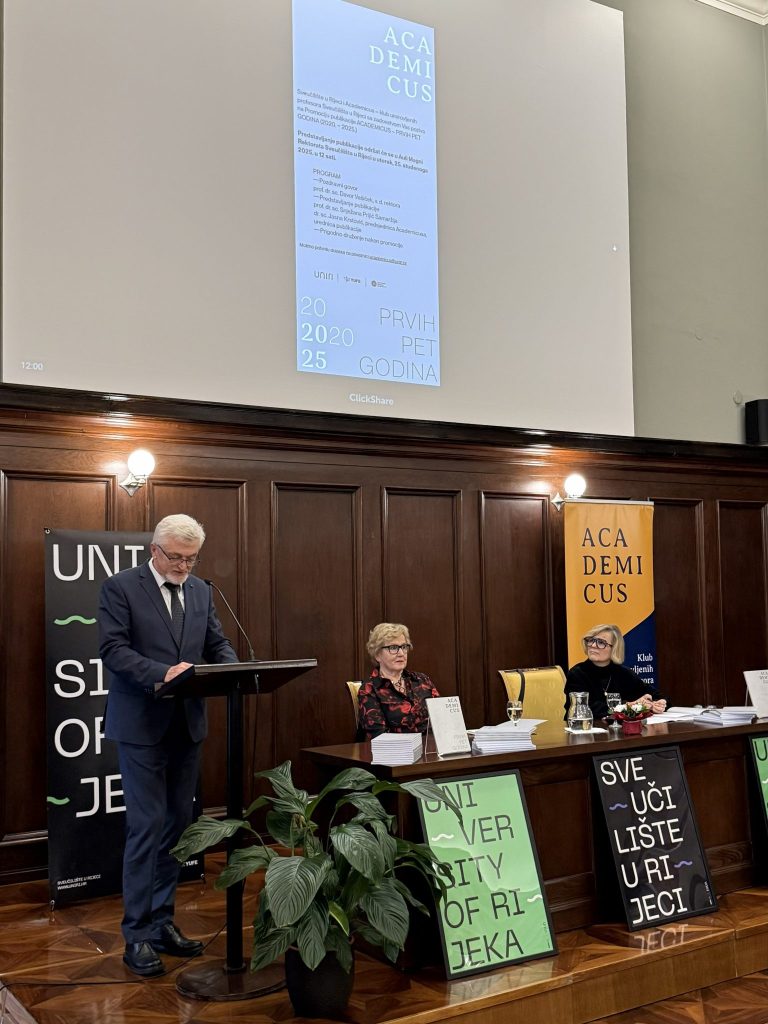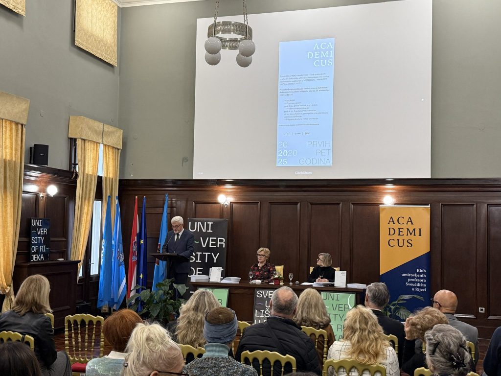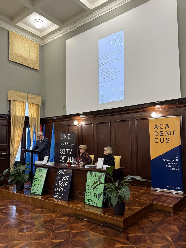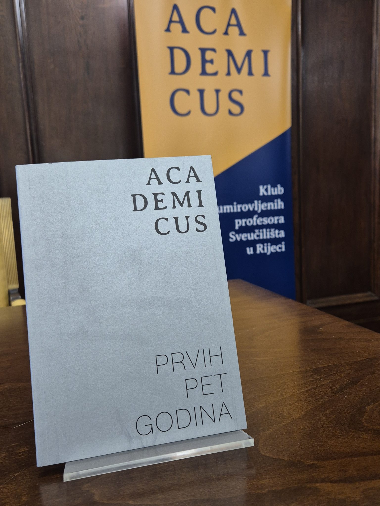 Današnjim predstavljanjem publikacije „Prvih pet godina Academicusa, kluba umirovljenih profesora Sveučilišta u Rijeci (2020.–2025.)”, održanom u Auli Magni Rektorata Sveučilišta u Rijeci, prigodno je obilježen 5. rođendan Academicusa. Radi se o monografiji koja u 10 poglavlja opisuje organizacijski razvoj, identitet i aktivnosti Academicusa, a u njezinu stvaranju i pisanju sudjelovali su članovi i članice Izvršnoga odbora: dr. sc. Jasna Krstović, dr. sc. Diana Stolac, prof. emerita, dr. sc. Bruno Grbac, prof. emeritus, dr. sc. Neda Vitezić, dr. sc. Zoran Mrša, dr. sc. Božana Knežević i mr. sc. Jadranka Martić. Uredništvo publikacije potpisuju dr. sc. Jasna Krstović, ujedno i predsjednica Kluba, te dr. sc. Bruno Grbac, profesor emeritus.