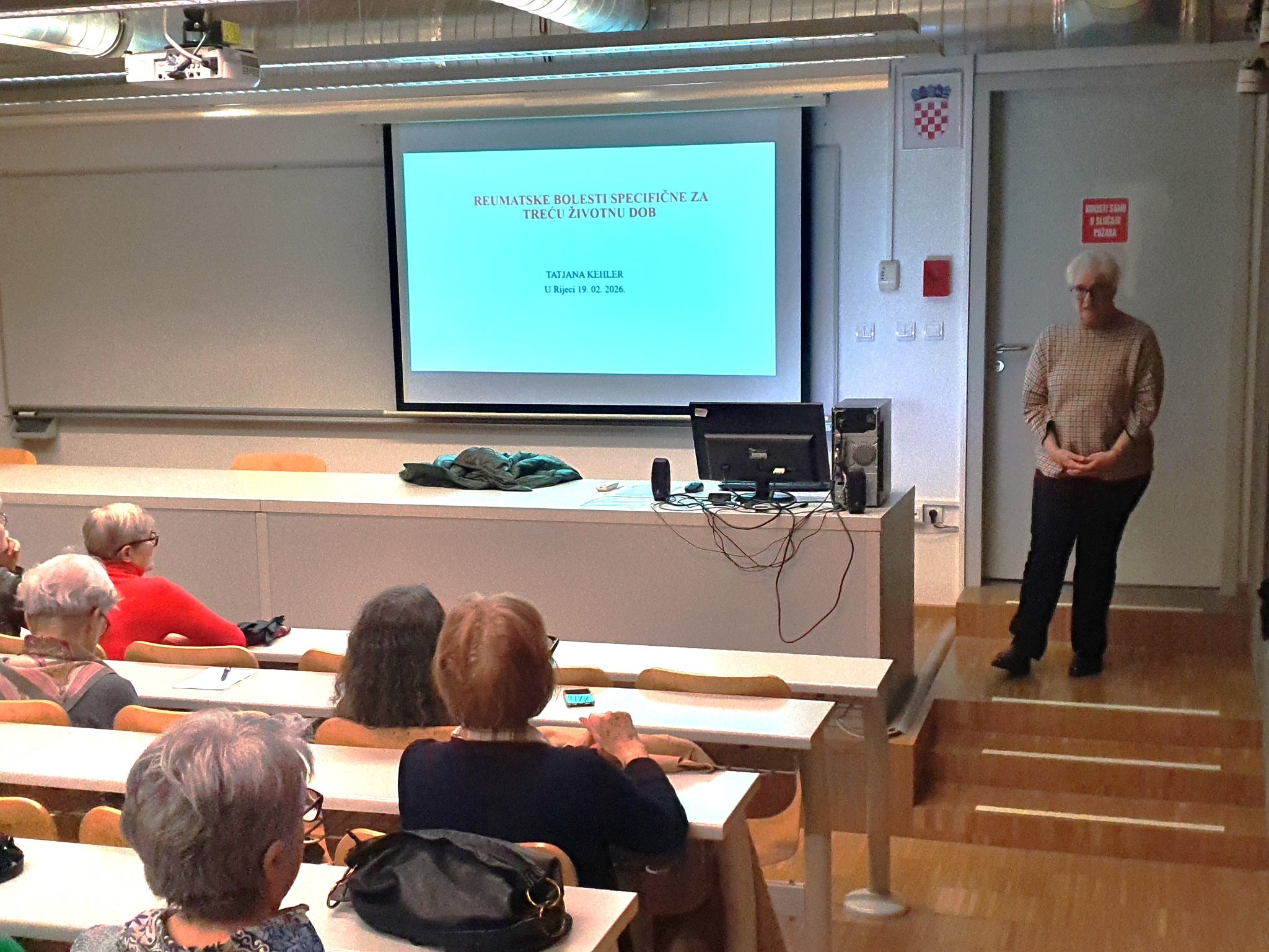 U četvrtak, 19. veljače 2026. godine na Filozofskom fakultetu u Rijeci u sklopu programa Sveučilišta za 3. dob prof. dr. sc. Tatjana Kehler održala je predavanje Reumatske bolesti specifične za treću životnu dob. Polaznici su se upoznali s procesom starenja i pojavama reumatskih bolesti specifičnih za treću životnu dob, rizicima te o načinima očuvanja zdravlja i prevencije.