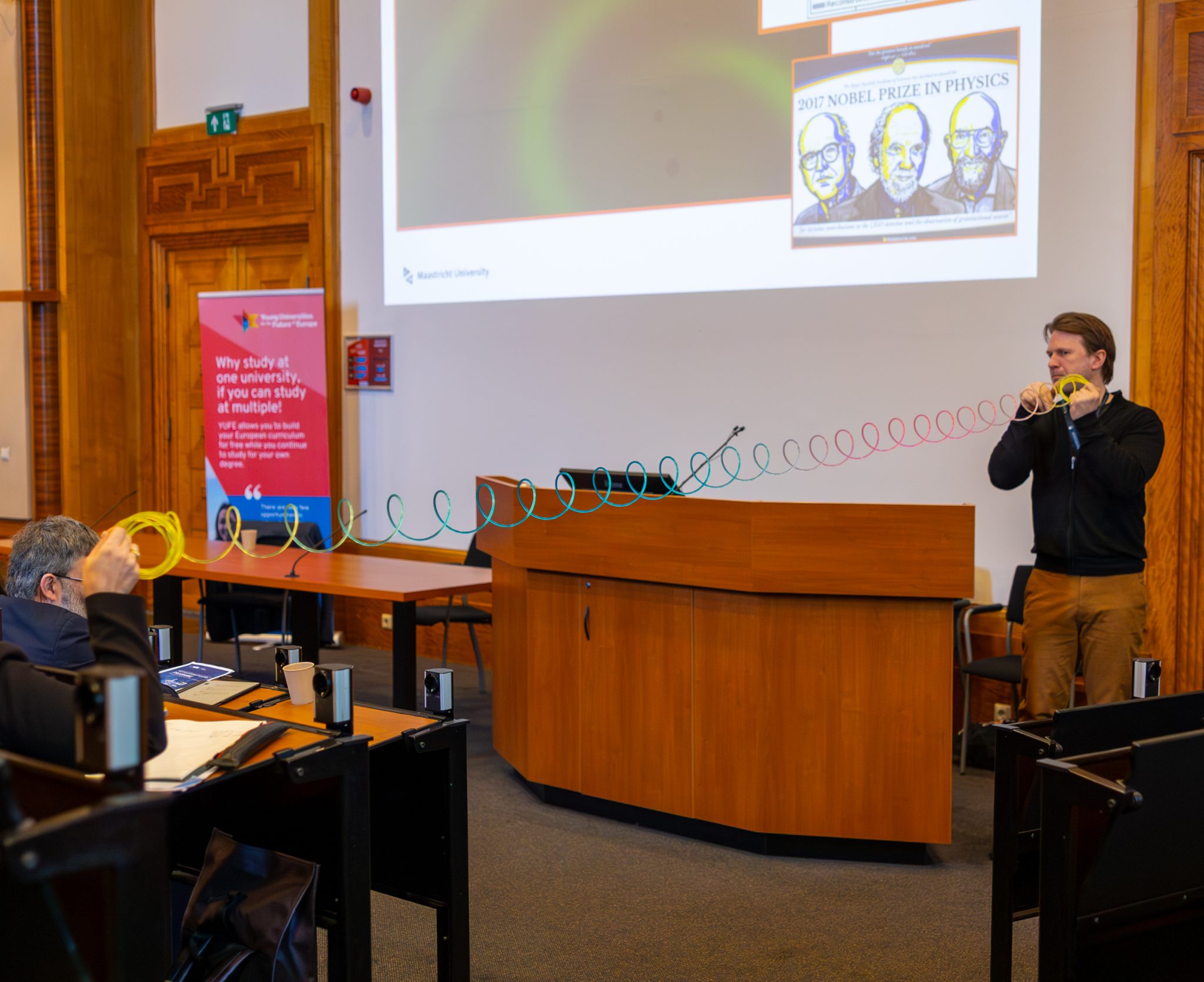 Ovogodišnje okupljanje održano je pod simboličnim sloganom „Dreaming Europe“, naglašavajući zajedničku viziju otvorenog i povezanog europskog akademskog prostora. U tom je kontekstu posebno zanimljivo bilo izlaganje prof. Gideon Koekoek sa Sveučilišta u Maastrichtu pod nazivom “Trinational Cooperation: Maastricht Model”. Govoreći o primjerima prekogranične akademske suradnje, Koekoek je istaknuo razvoj nizozemskog Instituta za gravitacijske valove i fundamentalnu fiziku koji je kroz međunarodnu suradnju u relativno kratkom razdoblju izrastao u jedno od vodećih istraživačkih središta u tom području u Europi.
